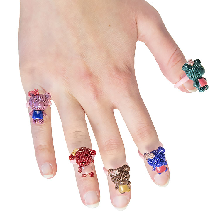 Набор колечек с нарядившимися на праздник котятами, медвежатами, мышатами и овечками. Разноцветные рубашечки, юбочки и платьица, а в прическе обязательно яркий бант или цветок!
