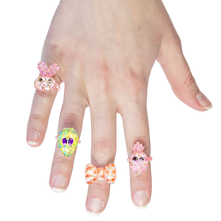 Набор колечек с глазастым ананасиком, к которому в гости пришли мышонок, котенок и зайчик.