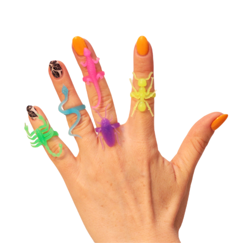 Коллекция игрушечных колечек в форме насекомых в разных цветовых решениях. Если экстравагантность – ваше второе имя, эти необычные неоновые колечки – самый верный выбор.