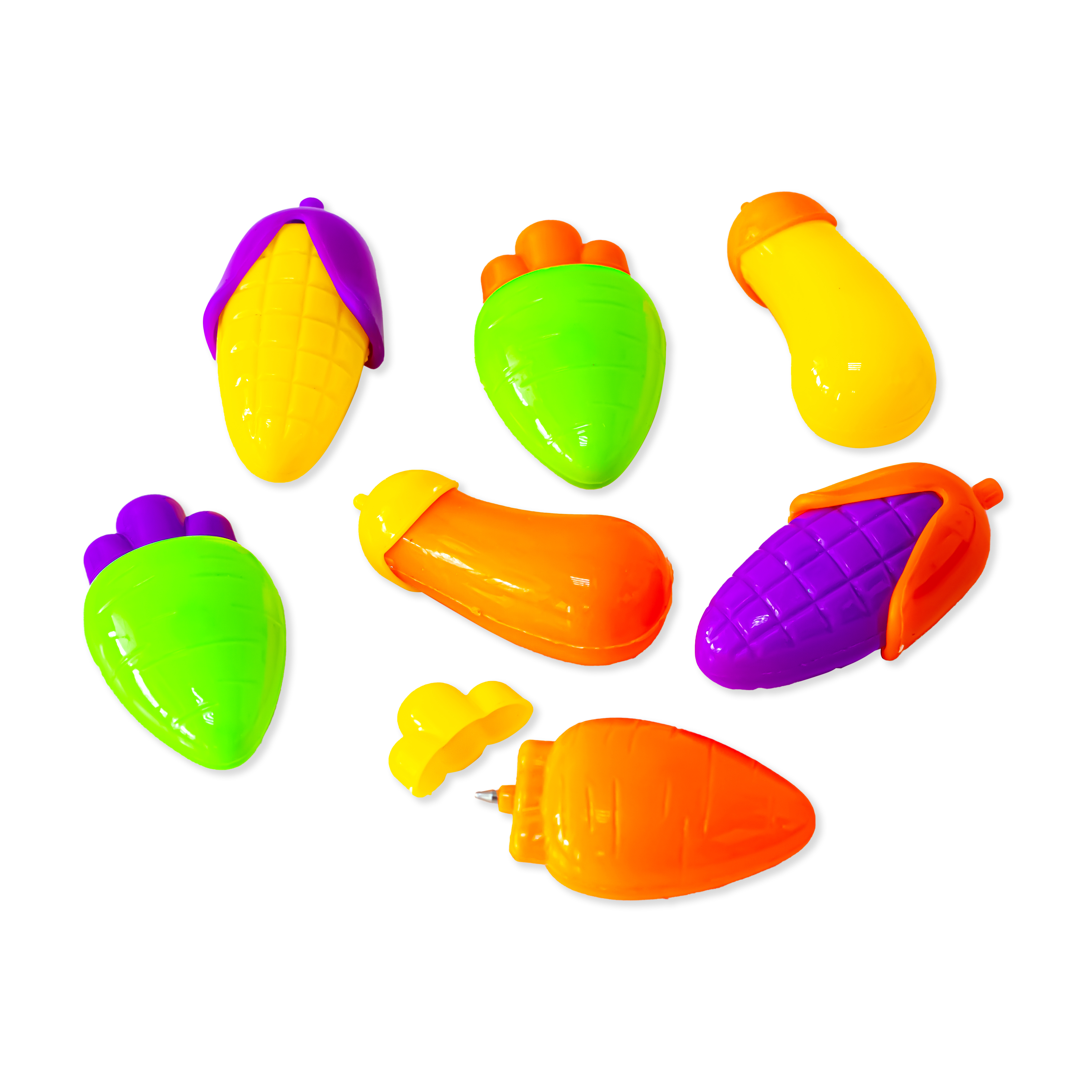В коллекции собраны прикольные миниатюрные ручки в форме баклажана, морковки, кукурузы. Их можно использовать как по прямому назначению – записывать уроки, рисовать и т.д, так и как мини-овощи для игрушечной кухни!