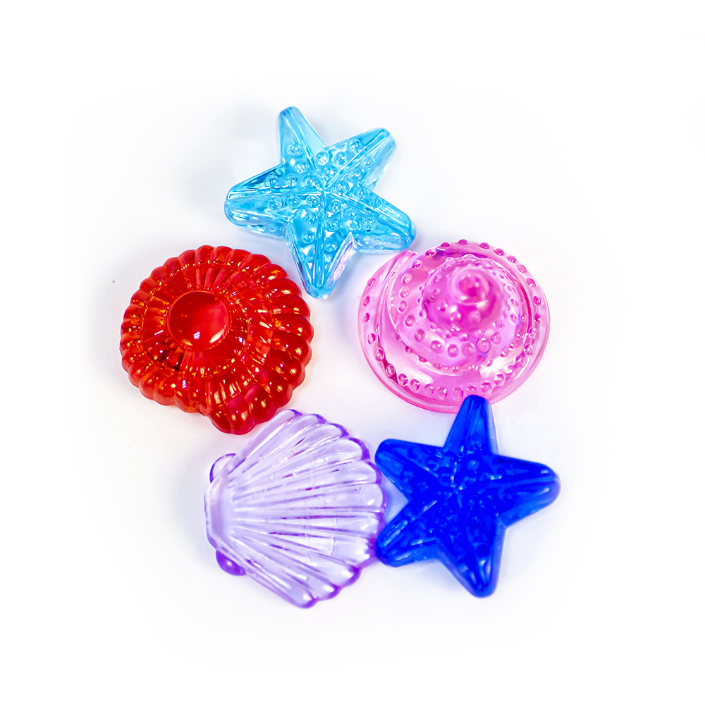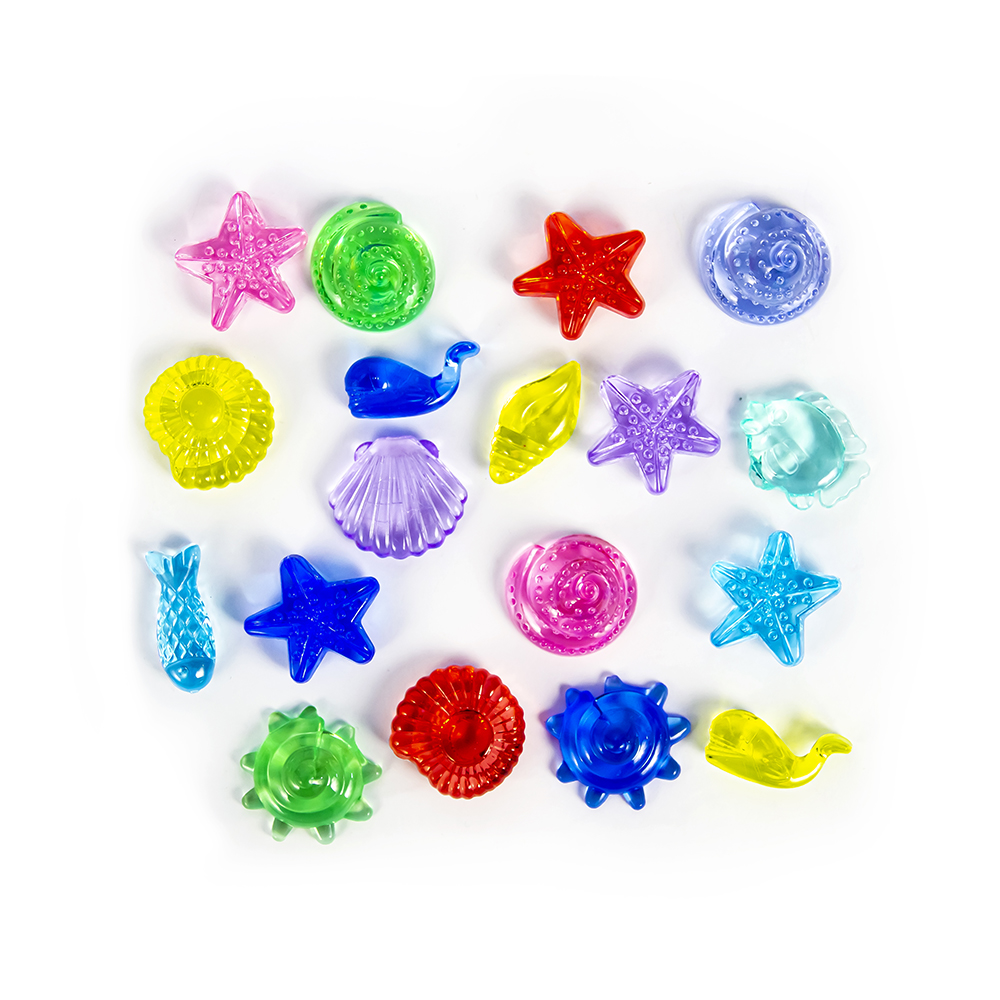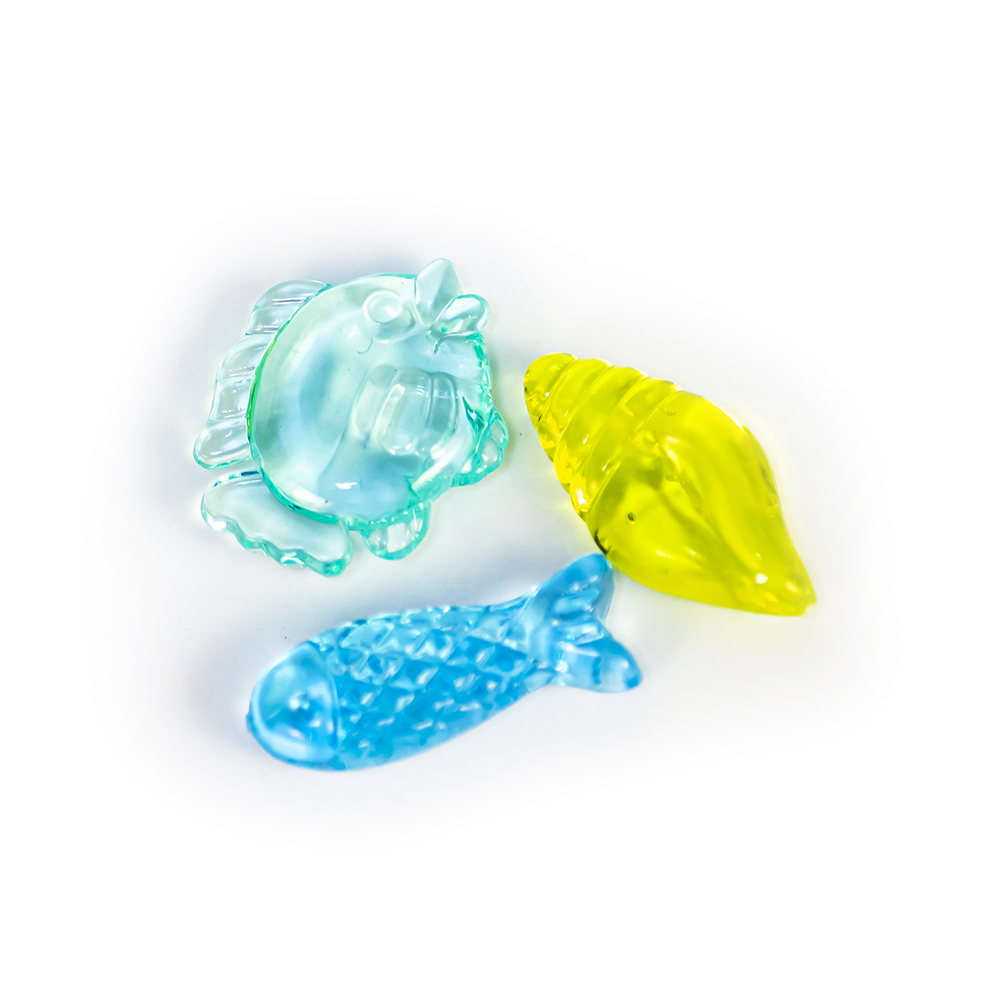 Коллекция ярких прозрачных объемных фигурок, изображающих морские звезды, раковины, дельфинов, рыбок и т.д. 15 дизайнов в цветах.