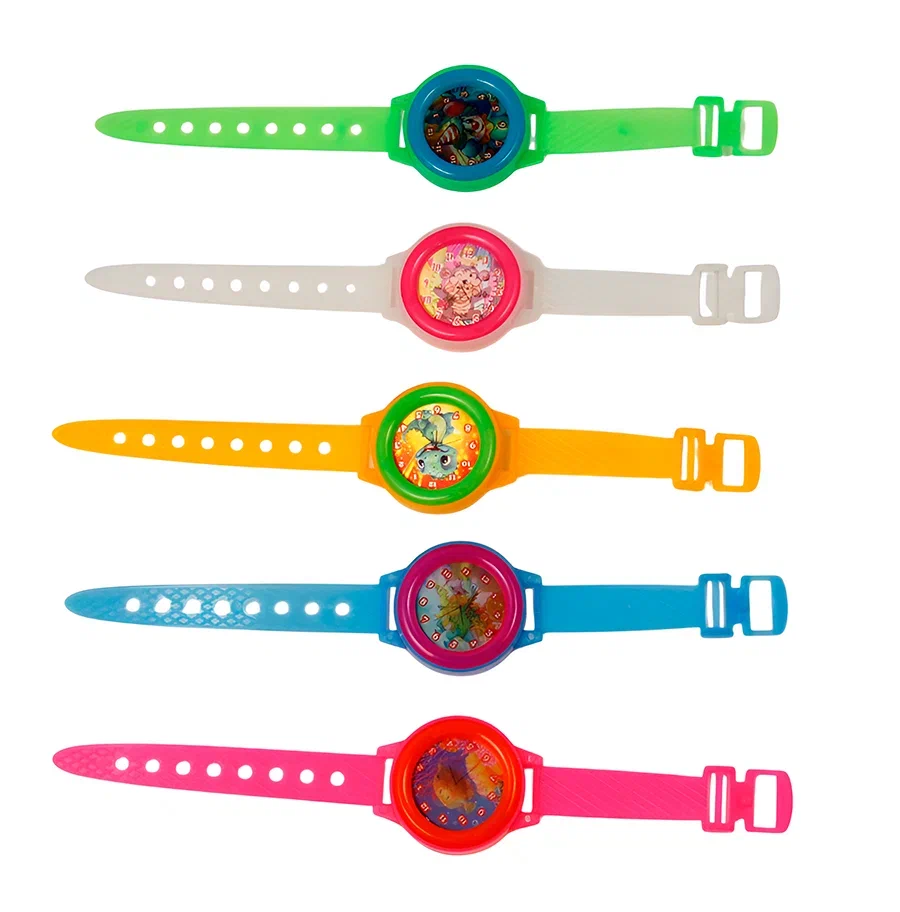 Набор разноцветных игрушечных часов на руку.