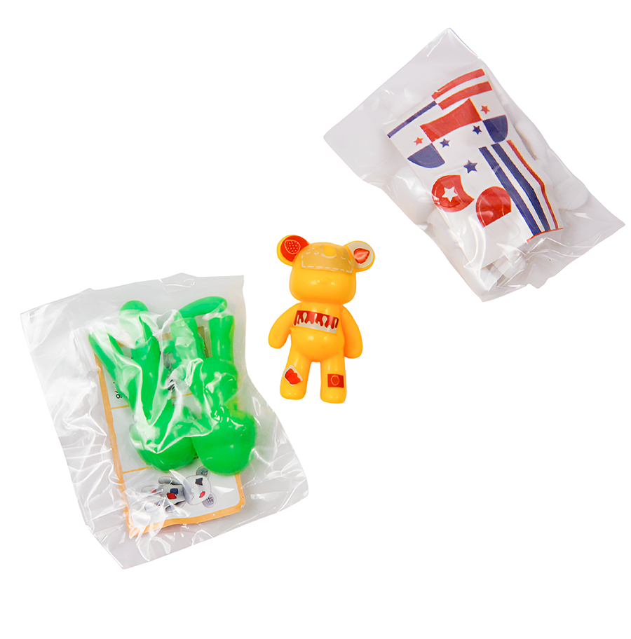 Каждая игрушка в индивидуальной упаковке, внутри: детали конструктора и набор наклеек.