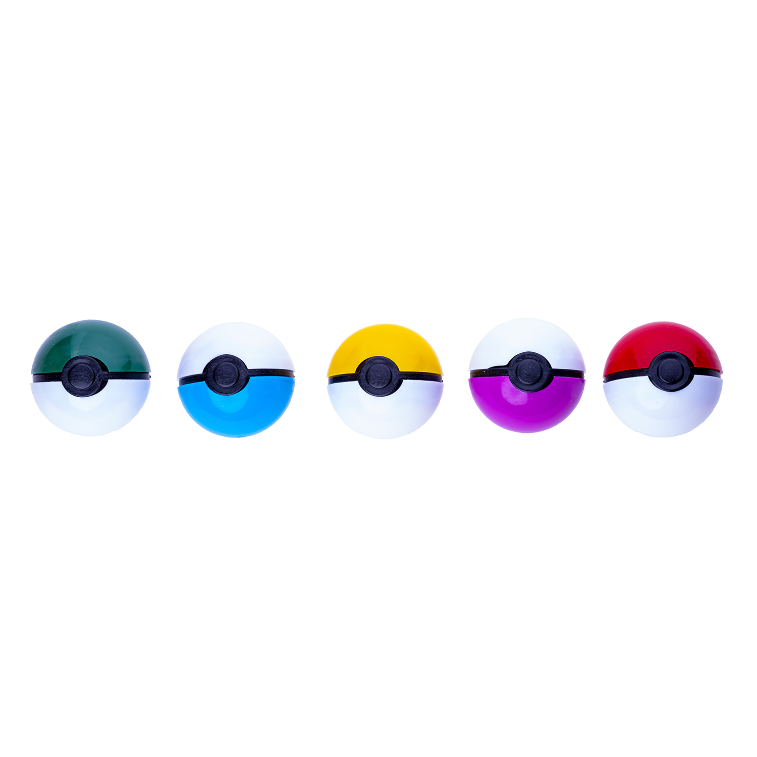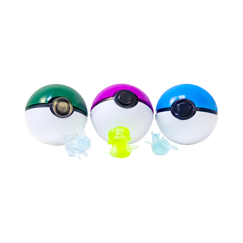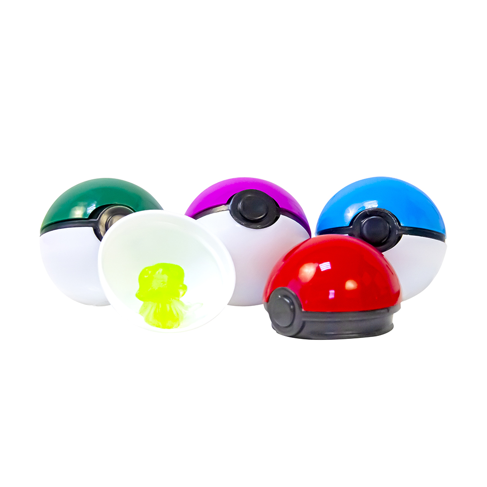 Разноцветные покемон-болы диаметром 40 мм, достаточно бросить на любую твердую поверхность, покебол раскроется и внутри окажется фигурка покемона и бонусные наклейки.
