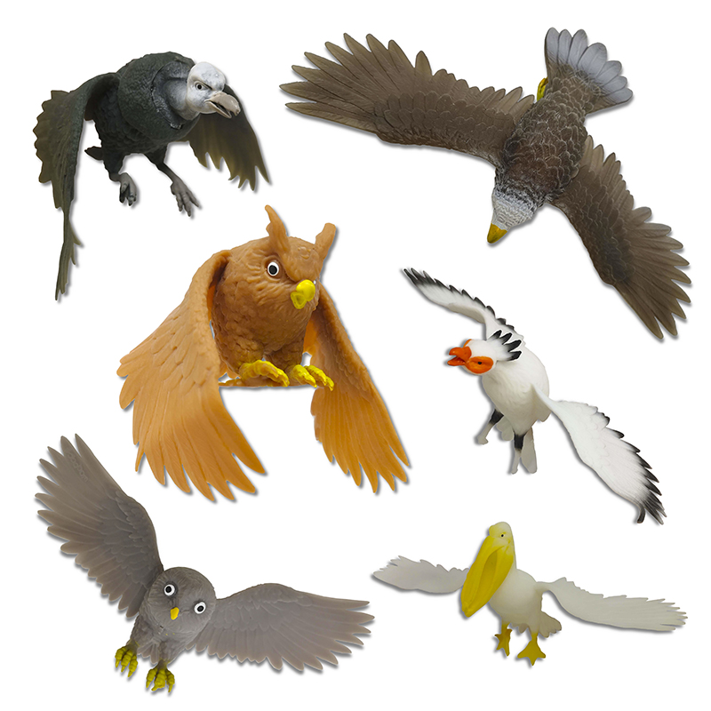 Коллекция состоит из 12 видов пернатых хищников: сокол, белоголовый орлан, пеликан, сапсан, кондор, серая неясыть, орел, сова, стервятник, беркут и др. Каждая фигурка упакована в непрозрачный пакетик вместе с буклетом, содержащим описание и характеристики птицы. Фигурки выполнены из приятного на ощупь, не имеющего неприятного запаха, тянущегося материала.