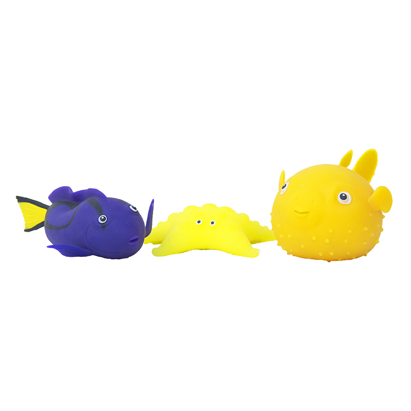 Коллекция состоит из 12 видов морских обитателей: морская звезда, мурена, акула, рыба-хирург, скат, спинорог и т.д.. Фигурки – это сквиши-антистресс.