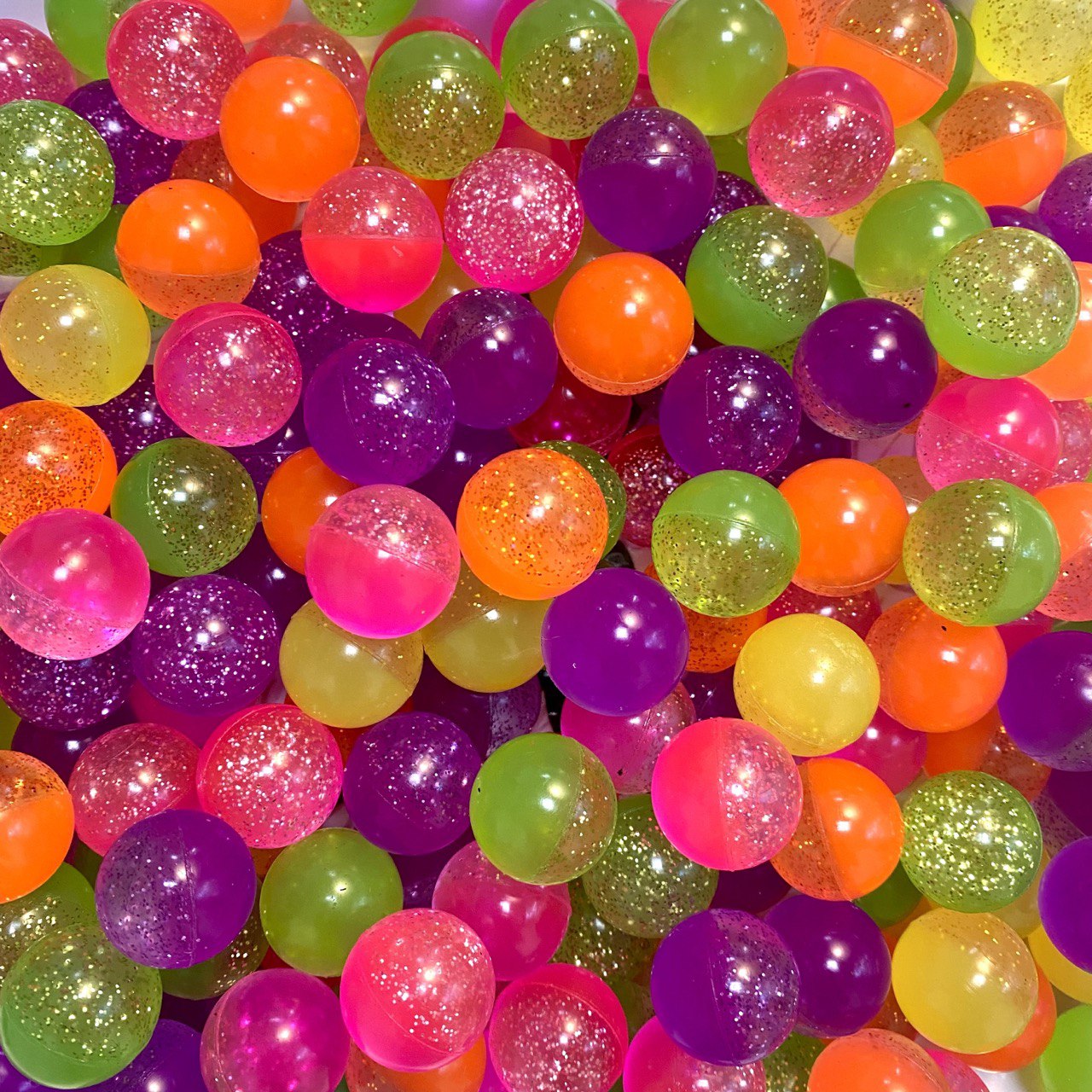 Время вечеринки! Красочных мячи-прыгуны, состоящих из двух половинок, одна из которых – полна блёсточек. Яркий и сверкающий микс.