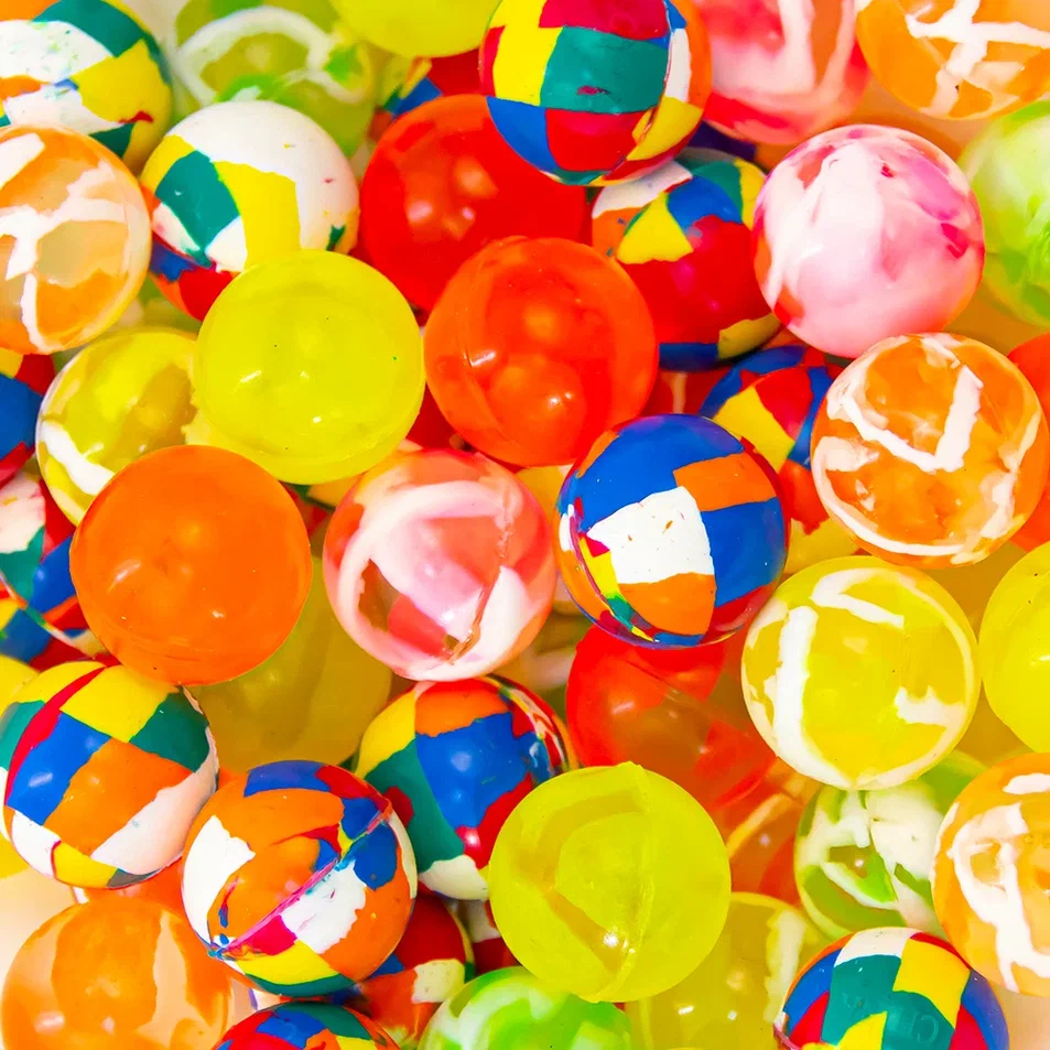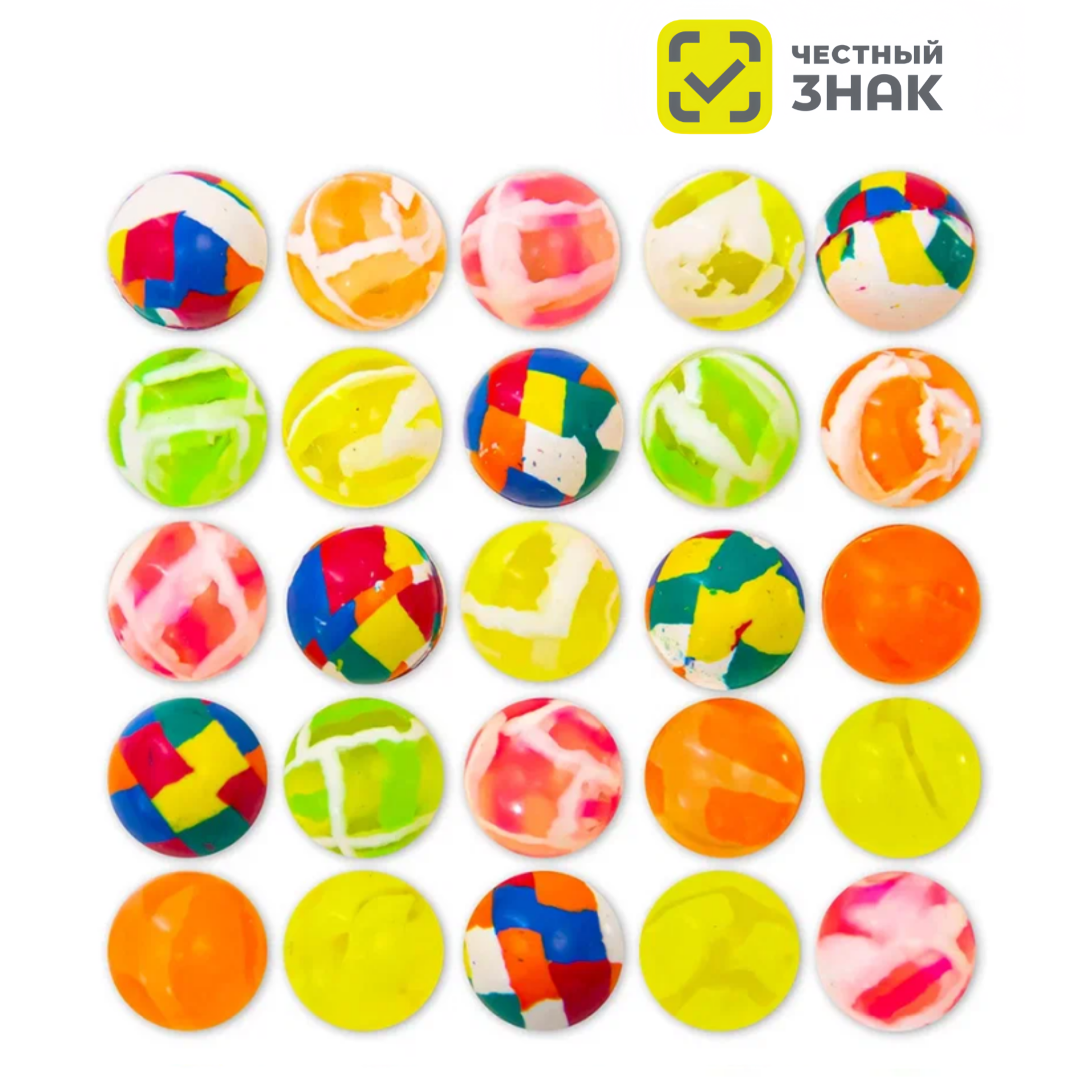 В наборе разные виды ярких и красивых мячей диаметра 25 мм. Сочетают в себе микс из мячиков с мозайкой и яркими прозрачными разводами.