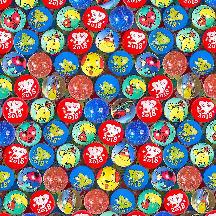 В миксе представлены разнообразные мячи новогодней тематики: полупрозрачные с рисунками Новогоднего талисмана 2018 года; мячи-прыгуны с принтами и цветные мячи-прыгуны.