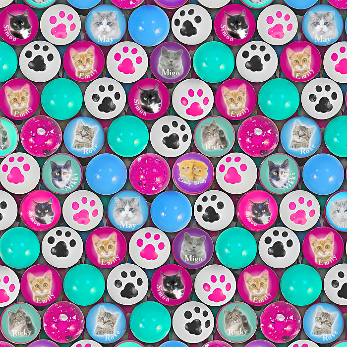 Коллекция состоит из разноцветных мячей-прыгунов с одной тематикой. Можно получить мячик с розовым принтом кошачьей лапки, ну а если повезет брутальный котик "Simon" займет место в изумительной кошачьей коллекции мячей.