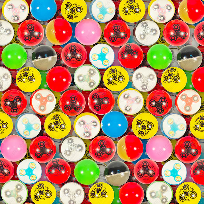 В миксе представлены полупрозрачные мячи-прыгуны с рисунками спинеров внутри мячей и с принтами спинеров на мячах.