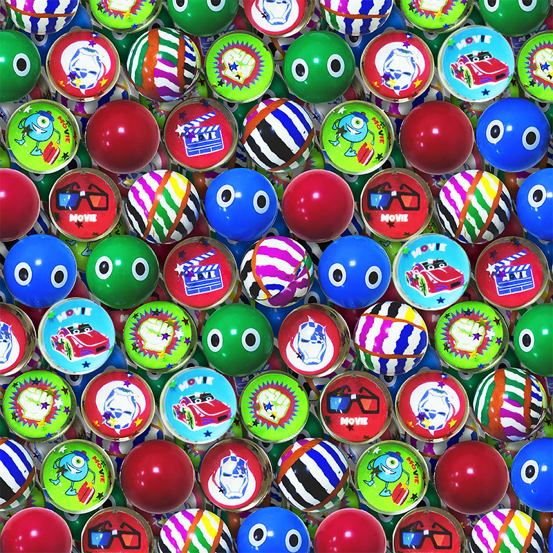 Всем детям нравится смотреть кино. Представляем Вашему вниманию дизайнерский микс мячи-прыгунов 27мм. Начинается создание фильма с хлопушки режиссера, и такой мячик счастливчик отыщет обязательно в автомате. А к хлопушке найдет еще и очки, и веселых героев.