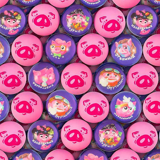 Коллекция состоит из разноцветных мячей-прыгунов с принтом хрюшек и полупрозрачных мячей-прыгунов с карточками-вкладышами с изображением различных персонажей в виде хрюшек.