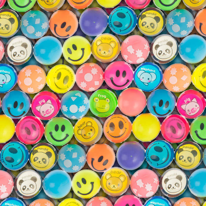 Набор содержит разноцветные мячи для автоматов с изображением смайликов и забавных животных.