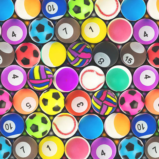 Набор содержит мячи-прыгуны для торговых автоматов на тему различных видов спорта.