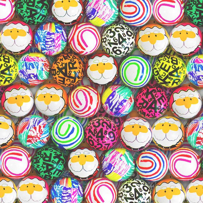 Набор содержит мячи-прыгуны для автоматов с изображением мудрых дедов и мячики с цифрами и буквами английского алфавита, а также другие разноцветные попрыгунчики.