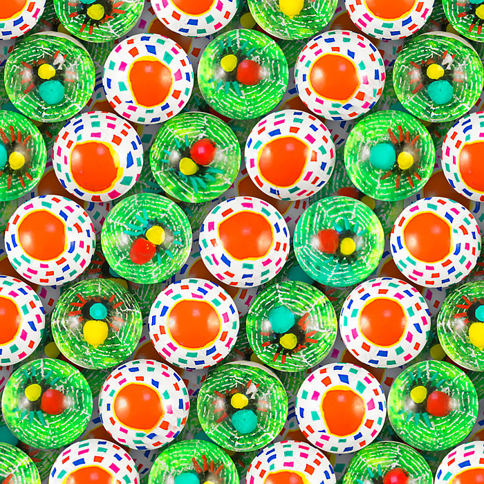 Микс состоит из полупрозрачных мячиков-попрыгунчиков с объемными фигурами разноцветных пауков внутри мячей.
