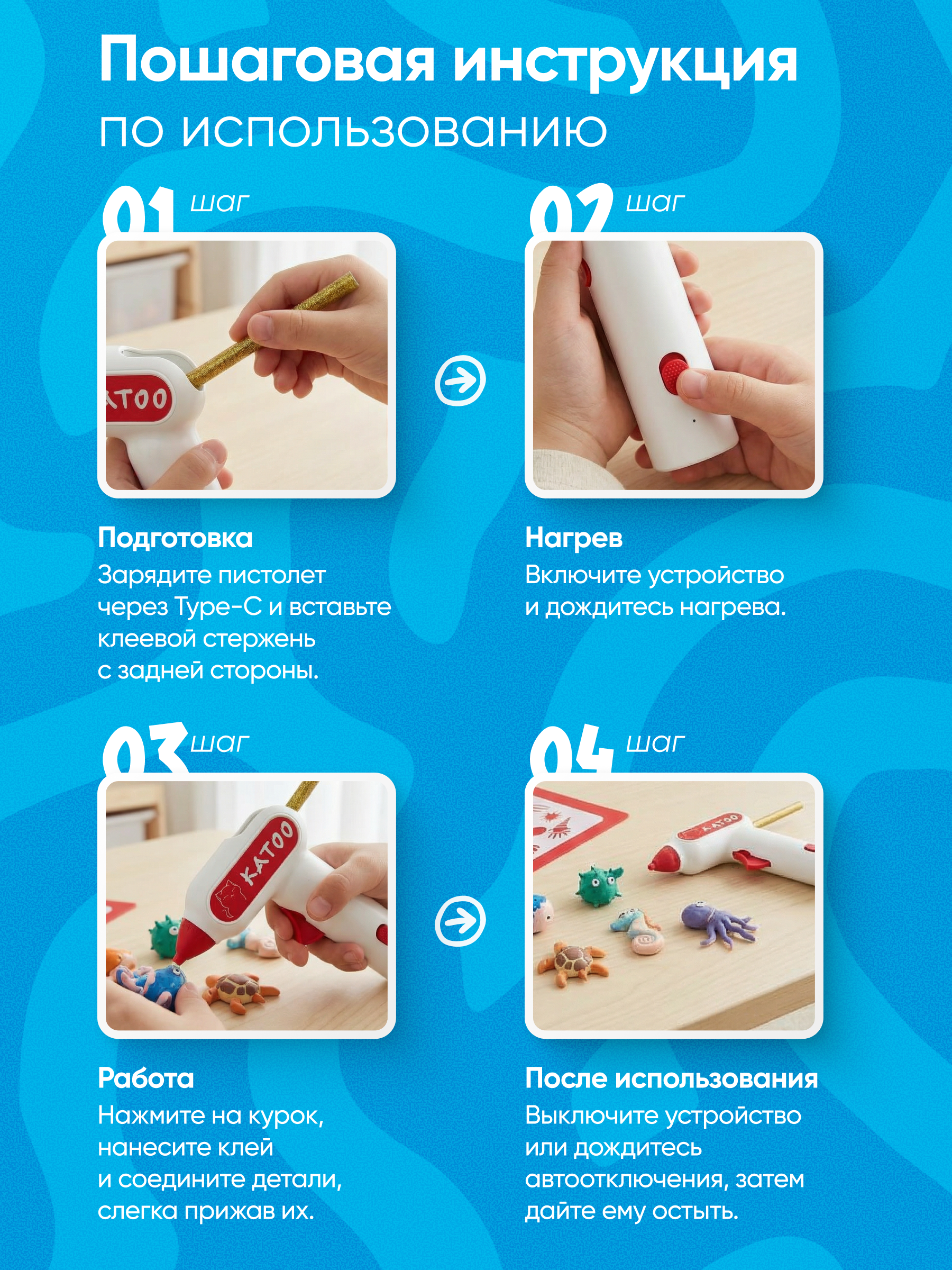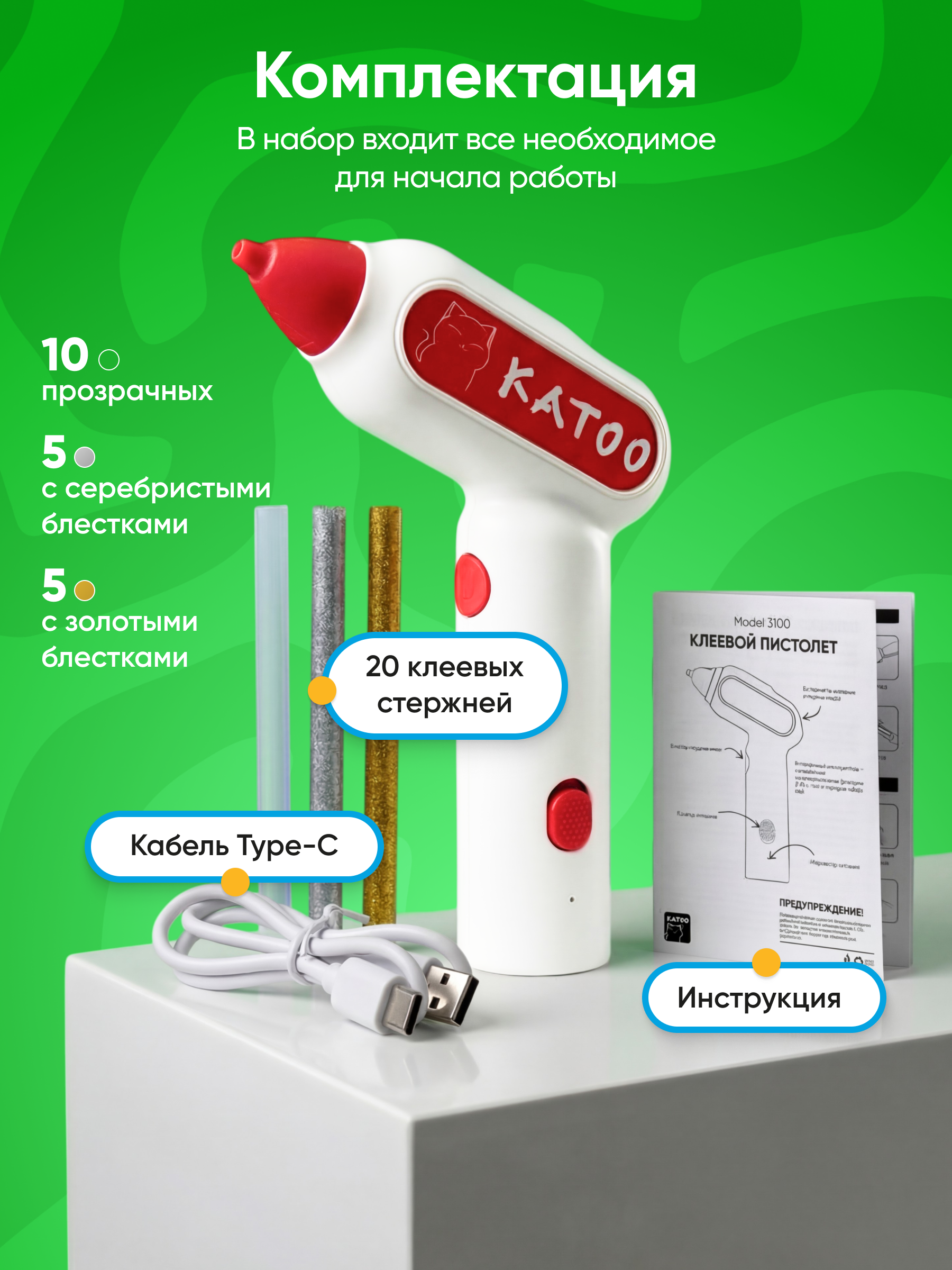 В наборе уже есть всё для старта: клеевой пистолет со стержнями, кабель Type-C, инструкция и 20 стержней (10 прозрачных, 5 с золотистыми и 5 с серебристыми блестками). Размер стержней — 7×100 мм.
