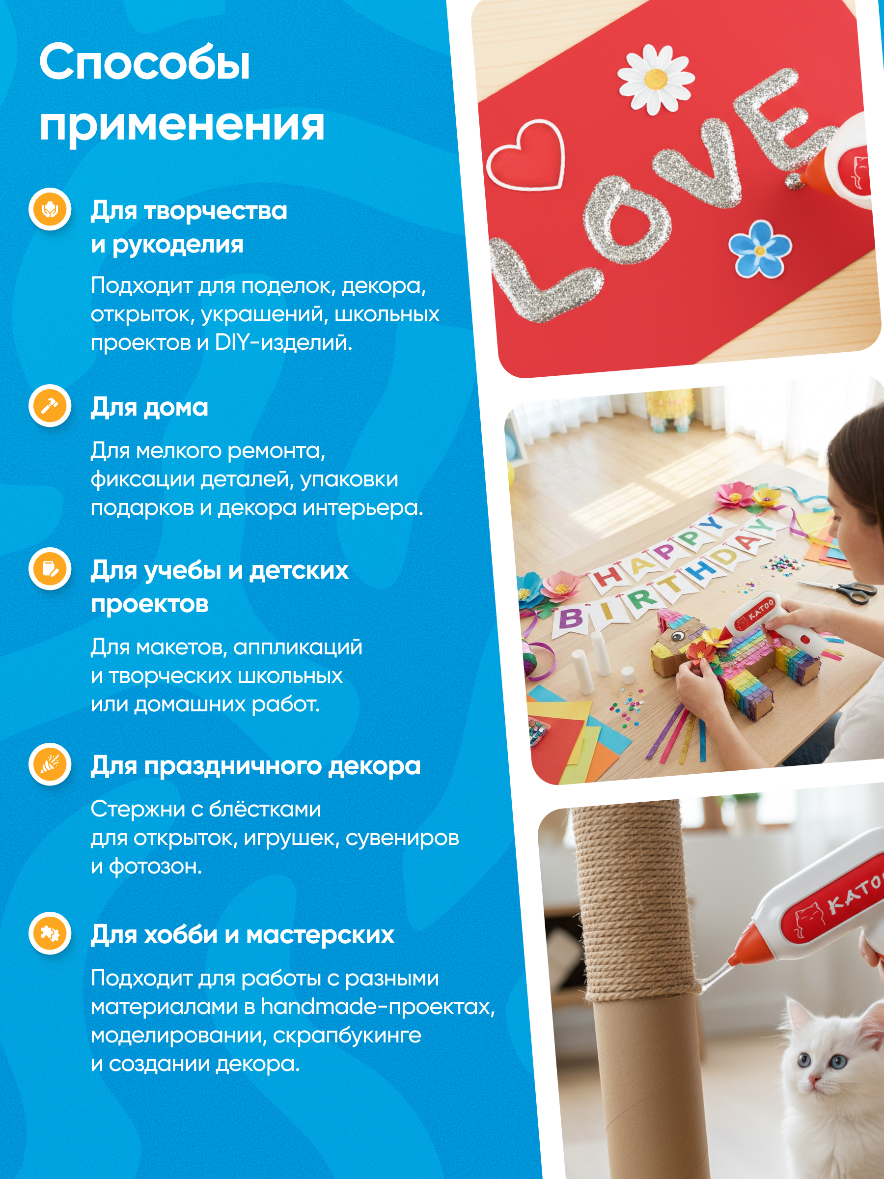 Нагрев всего за 1 минуту — начинайте работу сразу. Стержни обеспечивают ровную подачу клея и надежную фиксацию.