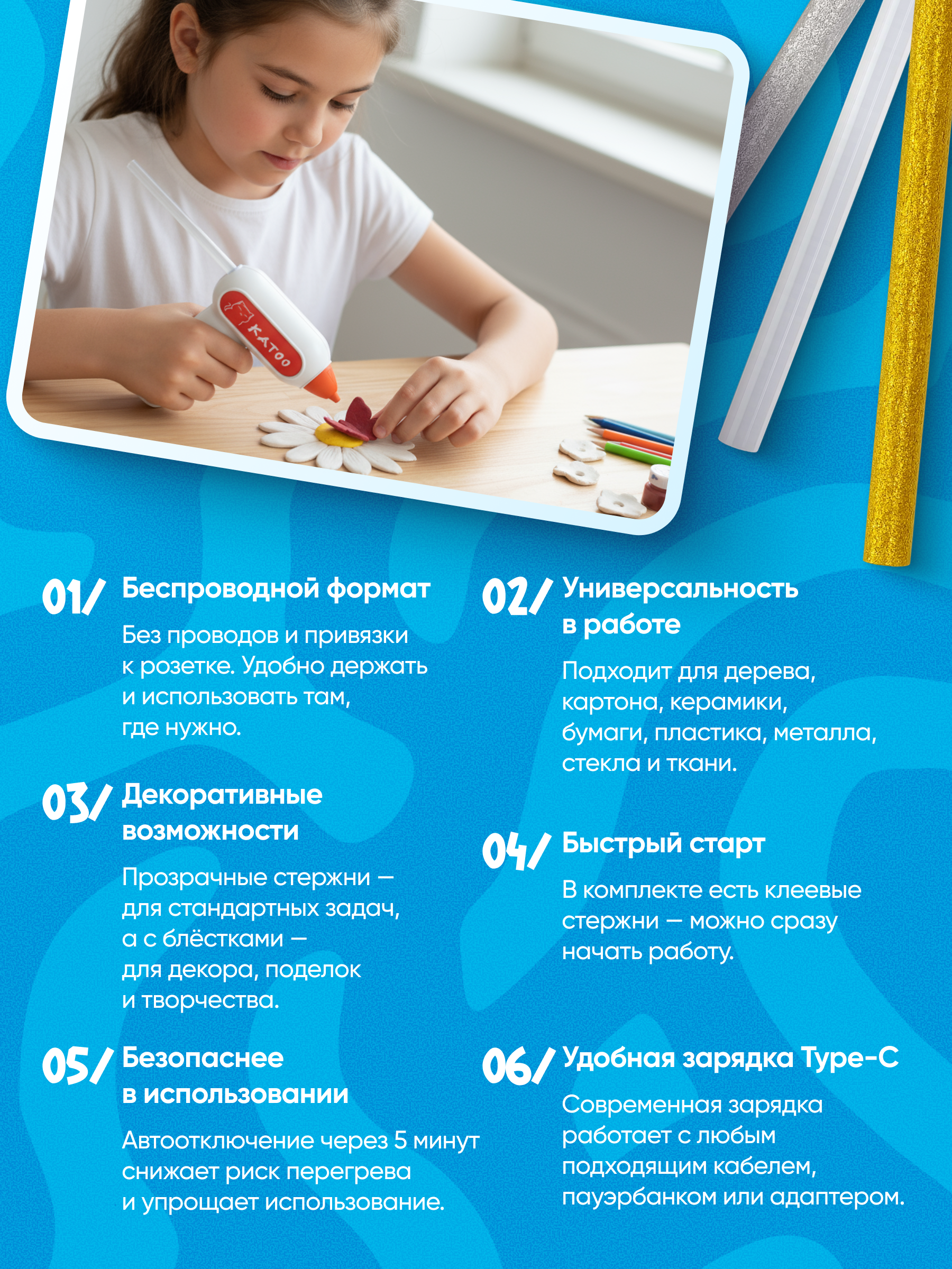 Закрытый силиконовый наконечник снижает риск ожогов, а автоматическое отключение через 5 минут защищает от перегрева. Легкая кнопка подачи позволяет точно контролировать расход клея.